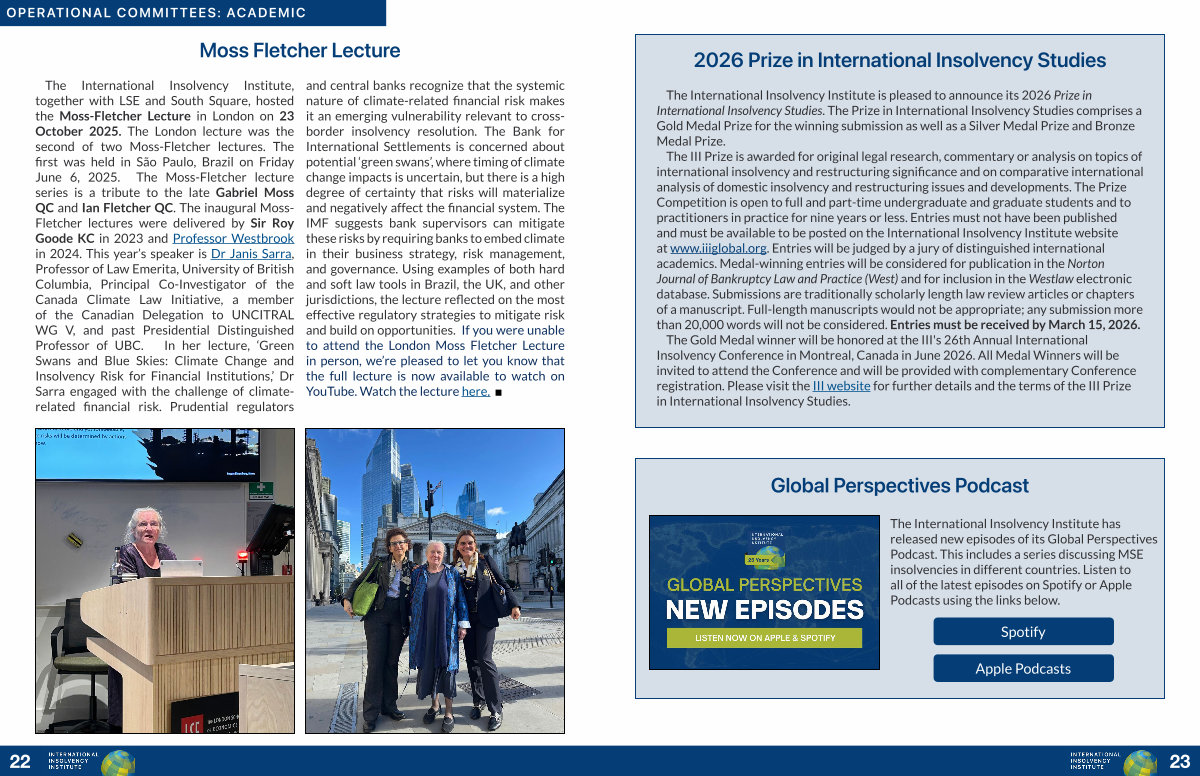 The International Insolvency Institute has released new episodes of its Global Perspectives Podcast. This includes a series discussing MSE insolvencies in different countries. Listen to all of the latest episodes on Spotify or Apple Podcasts using the links below.