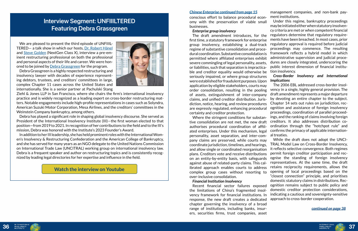 Chinese Enterprise continued from page 15 conscious effort to balance procedural economy with the preservation of viable small businesses. Enterprise group insolvency The draft amendment introduces, for the first time, a statutory framework for enterprise group insolvency, establishing a dual-track regime of substantive consolidation and procedural coordination. Substantive consolidation is permitted where affiliated enterprises exhibit severe commingling of legal personality, assets, or liabilities, such that separation is impracticable and creditor equality would otherwise be seriously impaired, or where group structures were established for fraudulent purposes. Upon application by eligible stakeholders, courts may order consolidation, resulting in the pooling of assets, extinguishment of inter-company claims, and unified creditor distribution. Jurisdiction, notice, hearing, and review procedures are expressly regulated, enhancing procedural certainty and creditor protection.