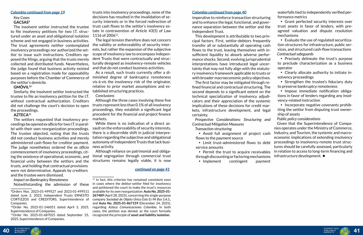 Order No. 2025-01-687025 dated September 25, 2025, Superintendence of Companies. trusts into insolvency proceedings, none of the decisions has resulted in the invalidation of security interests or in the forced redirection of trust cash flows to the settlor’ s insolvency estate in contravention of Article 43( 5) of Law 1116 of 2006 12.