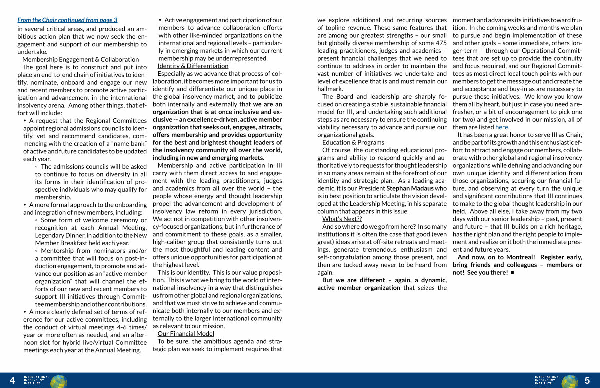 It has been a great honor to serve III as Chair, and be part of its growth and this enthusiastic effort to attract and engage our members, collaborate with other global and regional insolvency organizations while defining and advancing our own unique identity and differentiation from those organizations, securing our financial future, and observing at every turn the unique and significant contributions that III continues to make to the global thought leadership in our field. Above all else, I take away from my two days with our senior leadership – past, present and future – that III builds on a rich heritage, has the right plan and the right people to implement and realize on it both the immediate present and future years.