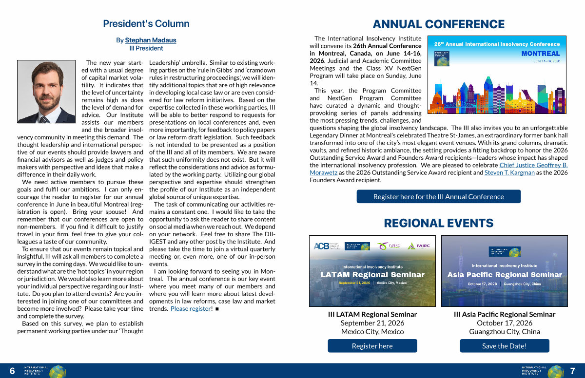 The new year started with a usual degree of capital market volatility. It indicates that the level of uncertainty remains high as does the level of demand for advice. Our Institute assists our members and the broader insolvency community in meeting this demand. The thought leadership and international perspective of our events should provide lawyers and financial advisors as well as judges and policy makers with perspective and ideas that make a difference in their daily work.
