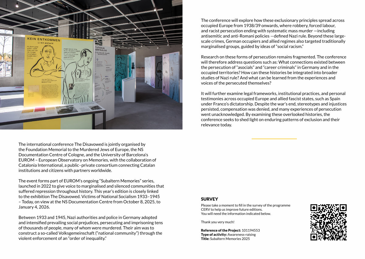 The event forms part of EUROM’ s ongoing“ Subaltern Memories” series, launched in 2022 to give voice to marginalised and silenced communities that suffered repression throughout history. This year’ s edition is closely linked to the exhibition The Disavowed. Victims of National Socialism 1933 – 1945 – Today, on view at the NS Documentation Centre from October 8, 2025, to January 4, 2026.