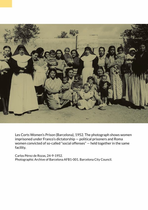 Les Corts Women’ s Prison( Barcelona), 1952. The photograph shows women imprisoned under Franco’ s dictatorship— political prisoners and Roma women convicted of so-called“ social offenses”— held together in the same facility.