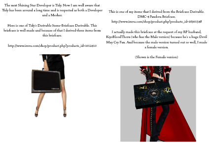 Here is one of Tidy's Derivable Items-Briefcase Derivable. This briefcase is well made and because of that I derived three items from this briefcase.