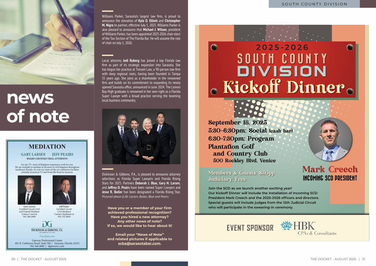 Join the SCD as we launch another exciting year! Our Kickoff Dinner will include the installation of Incoming SCD President Mark Creech and the 2025-2026 officers and directors. Special guests will include judges from the 12th Judicial Circuit who will participate in the swearing-in ceremony.