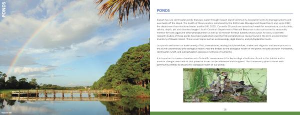 Kiawah has 122 stormwater ponds that pass water through Kiawah Island Community Association ’ s ( KICA ) drainage systems and eventually off the Island . The health of these ponds is monitored by the KICA ’ s Lake Management Department , and , since 1987 , the department has monitored water quality ( Hill , 2021 ). Currently 26 ponds are tested each week for temperature , conductivity , salinity , depth , pH , and dissolved oxygen . South Carolina ’ s Department of Natural Resources is also contracted to seasonally monitor for toxic algae and other phytoplankton as well as to monitor for fecal bacteria twice a year . At least 21 scientific research studies of these ponds have been published since the first comprehensive review found in the 1975 Environmental Inventory of Kiawah Island . These cover topics such as ecotoxicology , algal blooms , and phytoplankton levels .