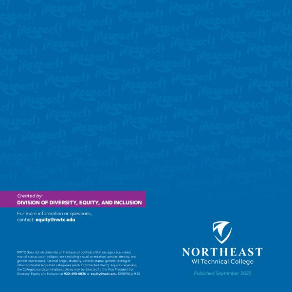 NWTC does not discriminate on the basis of political affiliation, age, race, creed, marital status, color, religion, sex( including sexual orientation, gender identity, and gender expression), national origin, disability, veteran status, genetic testing or other applicable legislated categories( each a“ protected class”). Inquires regarding the College’ s nondiscrimination policies may be directed to the Vice President for Diversity, Equity and Inclusion at 920-498-6826 or equity @ nwtc. edu. 1008798 je 9.22