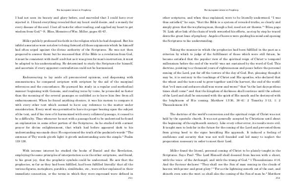 With intense interest he studied the books of Daniel and the Revelation, employing the same principles of interpretation as in the other scriptures, and found, to his great joy, that the prophetic symbols could be understood. He saw that the prophecies, so far as they had been fulfilled, had been fulfilled literally; that all the various figures, metaphors, parables, similitudes, etc., were either explained in their immediate connection, or the terms in which they were expressed were defined in