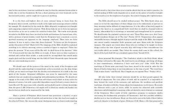 Jesus promised His disciples: " The Comforter, which is the Holy Ghost, whom the Father will send in My name, He shall teach you all things, and bring all things to your remembrance, whatsoever I have said unto you." John 14:26. But the teachings of Christ must previously have been stored in the mind in order for the Spirit of God to bring them to our remembrance in the time of peril. " Thy word have I hid in mine heart," said David, " that I might not sin against Thee." Psalm 119:11.