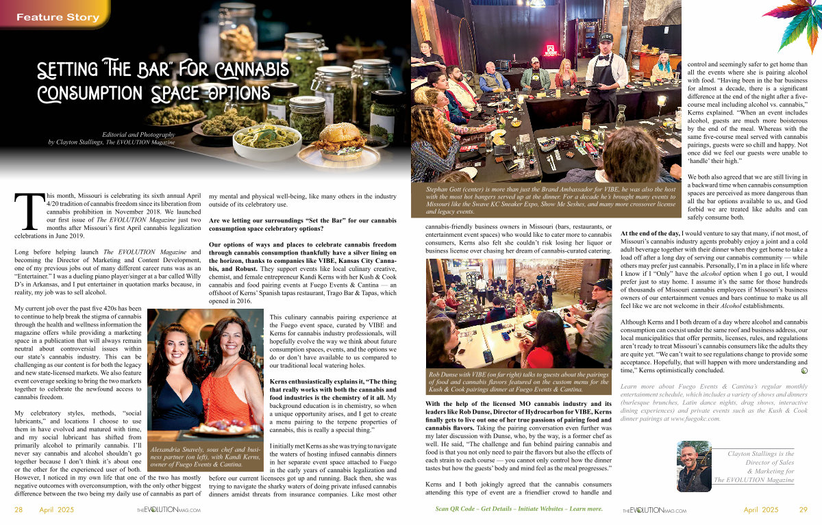 cannabis-friendly business owners in Missouri( bars, restaurants, or entertainment event spaces) who would like to cater more to cannabis consumers, Kerns also felt she couldn’ t risk losing her liquor or business license over chasing her dream of cannabis-curated catering. control and seemingly safer to get home than all the events where she is pairing alcohol with food.“ Having been in the bar business for almost a decade, there is a significant difference at the end of the night after a fivecourse meal including alcohol vs. cannabis,” Kerns explained.“ When an event includes alcohol, guests are much more boisterous by the end of the meal. Whereas with the same five-course meal served with cannabis pairings, guests were so chill and happy. Not once did we feel our guests were unable to‘ handle’ their high.”