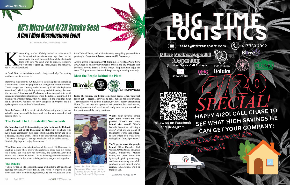 On Saturday, April 18, from 4 to 8 p. m., join the fun at the Ultimate 4 / 20 Smoke Sesh at 816 Dispensary in Platte City. Celebrate with KC’ s micro-community, meet the people behind the flower, and enjoy a relaxed, authentic event. This is a true consumption lounge night. This event is for ages 21 and up. No alcohol will be sold or served. Settle in, light up, and enjoy the moment.