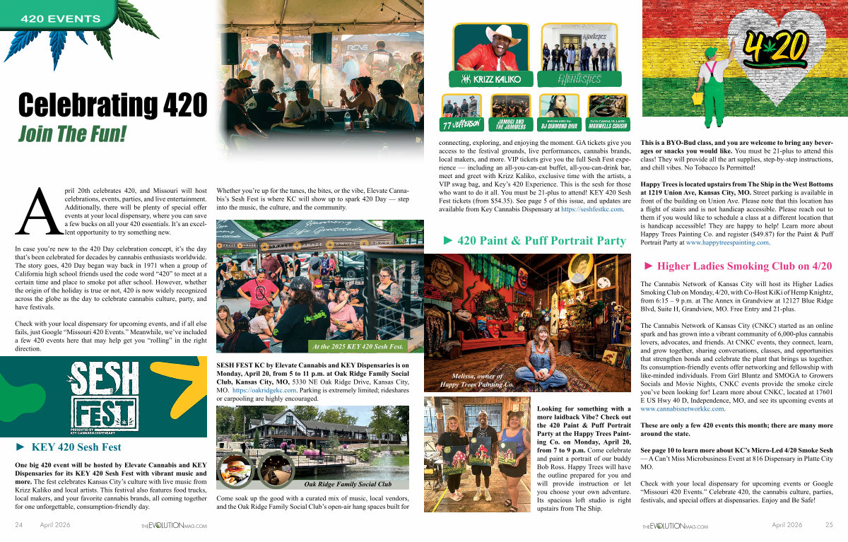 One big 420 event will be hosted by Elevate Cannabis and KEY Dispensaries for its KEY 420 Sesh Fest with vibrant music and more. The fest celebrates Kansas City’ s culture with live music from Krizz Kaliko and local artists. This festival also features food trucks, local makers, and your favorite cannabis brands, all coming together for one unforgettable, consumption-friendly day.
