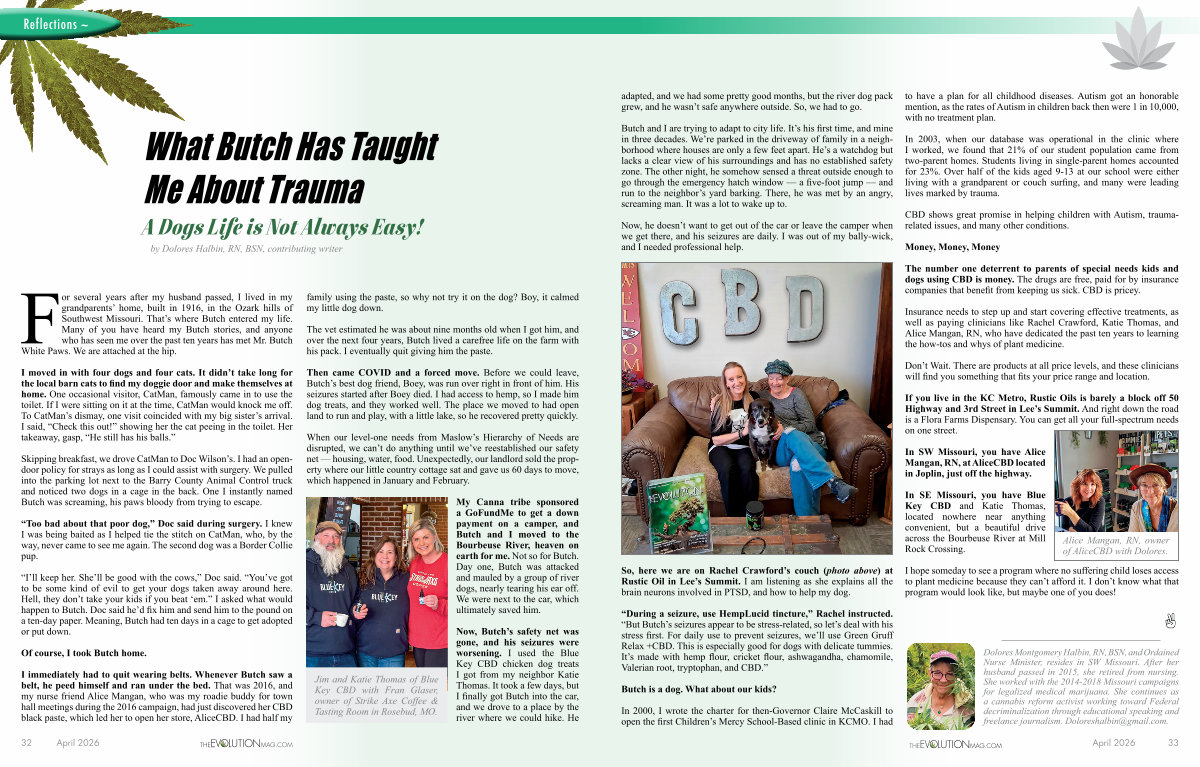 Then came COVID and a forced move. Before we could leave, Butch’ s best dog friend, Boey, was run over right in front of him. His seizures started after Boey died. I had access to hemp, so I made him dog treats, and they worked well. The place we moved to had open land to run and play, with a little lake, so he recovered pretty quickly.