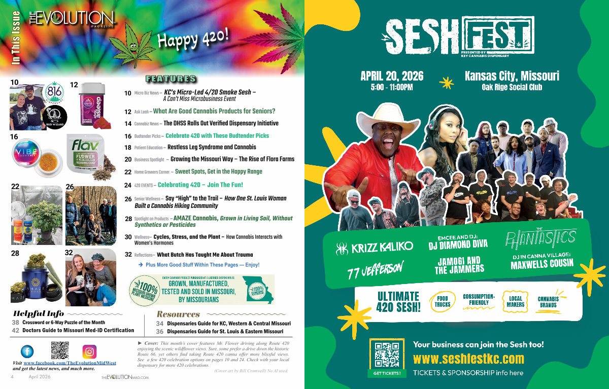 Ask Leah −What Are Good Cannabis Products for Seniors? Cannabiz News − The DHSS Rolls Out Verified Dispensary Initiative Budtender Picks − Celebrate 420 with These Budtender Picks Patient Education − Restless Leg Syndrome and Cannabis Business Spotlight − Growing the Missouri Way – The Rise of Flora Farms Home Growers Corner − Sweet Spots, Get in the Happy Range 420 EVENTS − Celebrating 420 – Join The Fun!