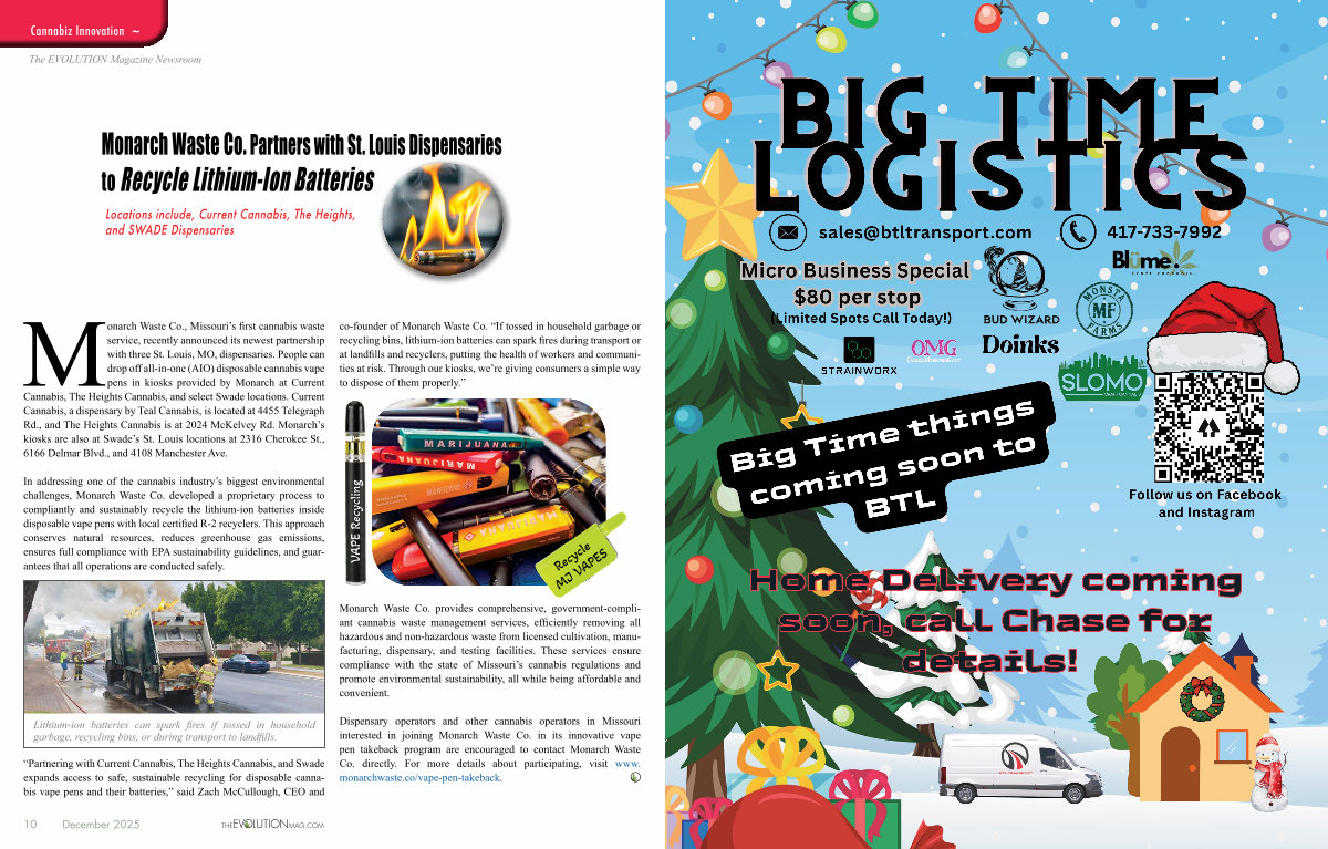 Monarch Waste Co., Missouri’ s first cannabis waste service, recently announced its newest partnership with three St. Louis, MO, dispensaries. People can drop off all-in-one( AIO) disposable cannabis vape pens in kiosks provided by Monarch at Current Cannabis, The Heights Cannabis, and select Swade locations. Current Cannabis, a dispensary by Teal Cannabis, is located at 4455 Telegraph Rd., and The Heights Cannabis is at 2024 McKelvey Rd. Monarch’ s kiosks are also at Swade’ s St. Louis locations at 2316 Cherokee St., 6166 Delmar Blvd., and 4108 Manchester Ave. co-founder of Monarch Waste Co.“ If tossed in household garbage or recycling bins, lithium-ion batteries can spark fires during transport or at landfills and recyclers, putting the health of workers and communities at risk. Through our kiosks, we’ re giving consumers a simple way to dispose of them properly.”