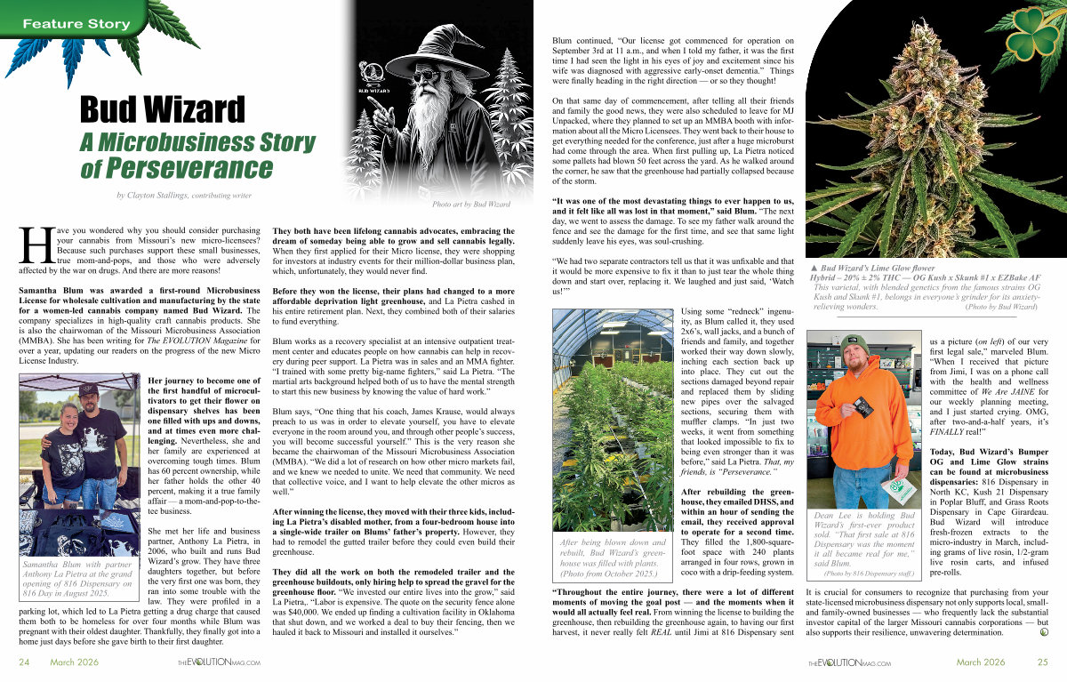 Samantha Blum was awarded a first-round Microbusiness License for wholesale cultivation and manufacturing by the state for a women-led cannabis company named Bud Wizard. The company specializes in high-quality craft cannabis products. She is also the chairwoman of the Missouri Microbusiness Association( MMBA). She has been writing for The EVOLUTION Magazine for over a year, updating our readers on the progress of the new Micro License Industry.