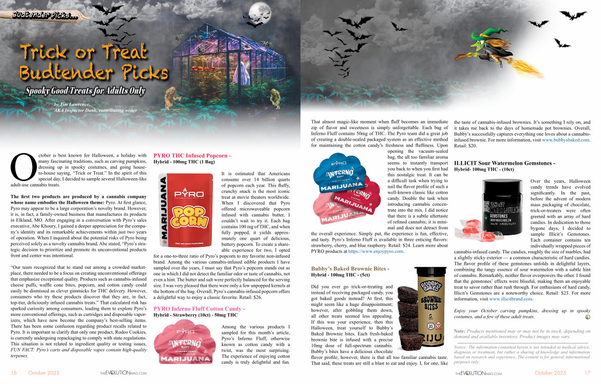 October is best known for Halloween, a holiday with many fascinating traditions, such as carving pumpkins, dressing up in spooky costumes, and going houseto-house saying,“ Trick or Treat.” In the spirit of this special day, I decided to sample several Halloween-like adult-use cannabis treats.