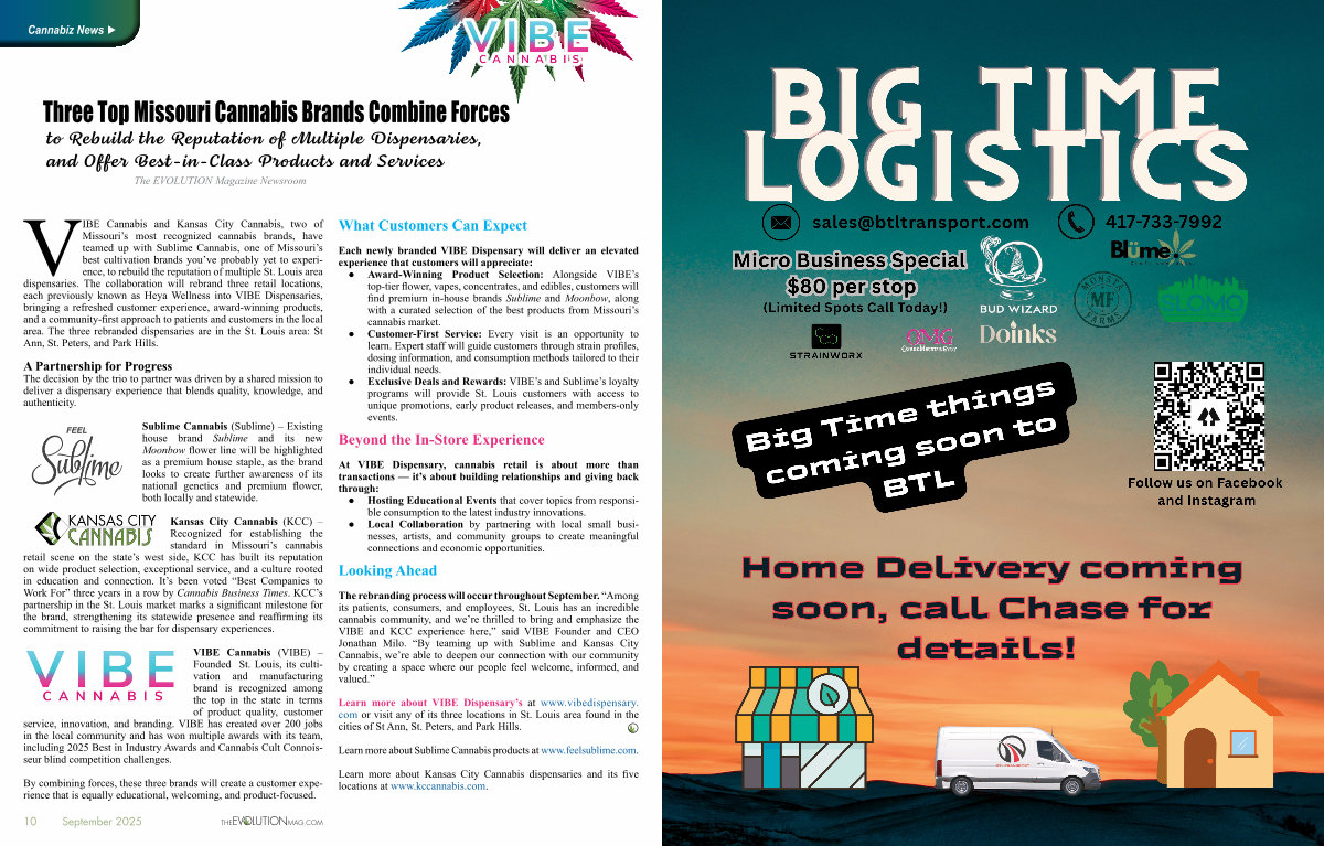 The rebranding process will occur throughout September.“ Among its patients, consumers, and employees, St. Louis has an incredible cannabis community, and we’ re thrilled to bring and emphasize the VIBE and KCC experience here,” said VIBE Founder and CEO Jonathan Milo.“ By teaming up with Sublime and Kansas City Cannabis, we’ re able to deepen our connection with our community by creating a space where our people feel welcome, informed, and valued.”