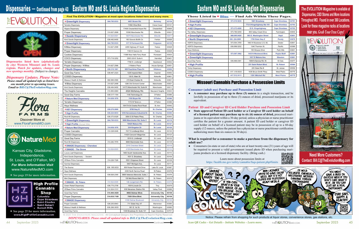 DISPENSARIES: Please email all updated info to Bill. C @ TheEvolutionMag. com.