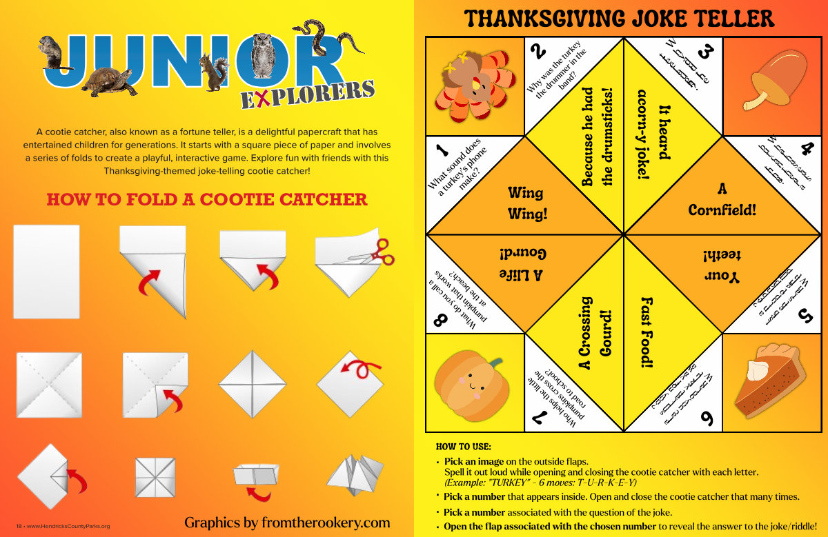 A cootie catcher, also known as a fortune teller, is a delightful papercraft that has entertained children for generations. It starts with a square piece of paper and involves a series of folds to create a playful, interactive game. Explore fun with friends with this Thanksgiving-themed joke-telling cootie catcher!