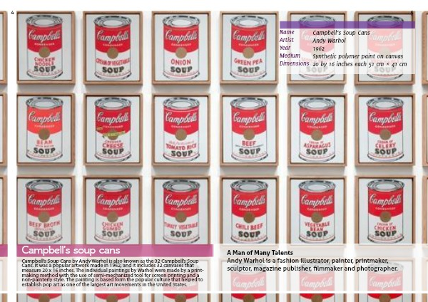 Campbell’s Soup Cans by Andy Warhol is also known as the 32 Campbell’s Soup Cans. It was popular artwork made in 1962, and it includes 32 canvases that measure 20 x 16 inches. The individual paintings by Warhol were made by a print-making method with the use of a semi-mechanized tool for screen printing and a non-painterly style. The painting is based on the popular culture that helped to establish pop art as one of the largest art movements in the United States.