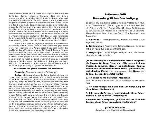Dadashri: Du musst dich an die Reine Seele im Innern von‘ Chandulal’ erinnern( die Person, die du falsch behandelt hast) – die Seele, die komplett getrennt ist von Verstand, Körper und Sprache, aufgeladenem Karma, subtilem-sich-entladendem Karma, grobem-sich-entladendem Karma( BhaavKarma, DravyaKarma, NoKarma) und an alle Anhaftung bezüglich seiner Person und dann Folgendes sagen: „ Liebe Reine Seele( Lord, Shuddhatma Bhagwan). Ich bitte um Vergebung für den Fehler, meine Stimme erhoben zu haben. Es ist mein fester Entschluss, diesen Fehler nicht zu wiederholen. Gib mir bitte die Energie( Shakti) das so zu tun.” Wenn du Dada oder die Reine Seele( Shuddhatma) anrufst und deinen Fehler eingestehst, nennt man das Alochana. PratiKraman ist die Entschuldigung für den Fehler und die Entschlossenheit, es nicht zu wiederholen ist Pratyakhyan. Wenn du einem Lebewesen Leid zufügst oder es verletzt, betrachtet man das als Atikraman und dafür musst du sofort Alochana, Pratikraman und Pratyakhyan machen.