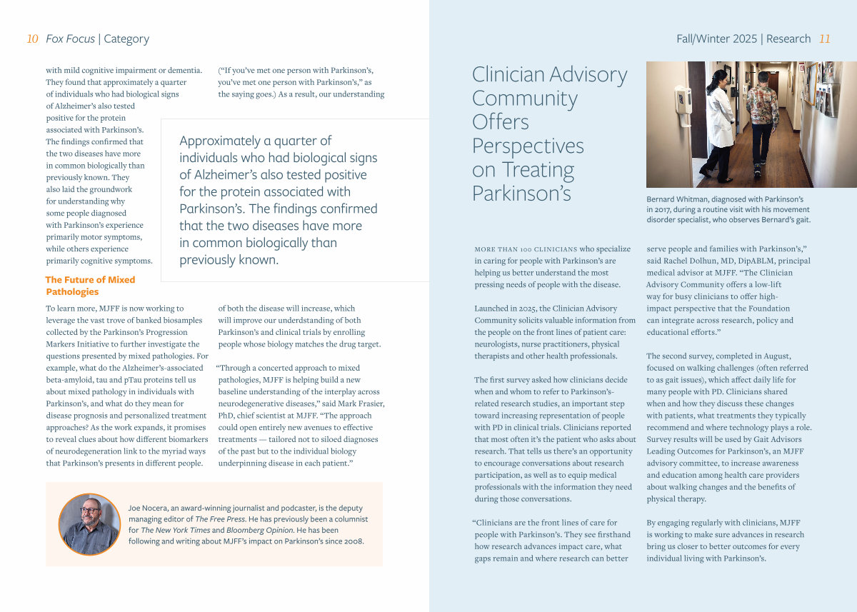 “ Through a concerted approach to mixed pathologies, MJFF is helping build a new baseline understanding of the interplay across neurodegenerative diseases,” said Mark Frasier, PhD, chief scientist at MJFF.“ The approach could open entirely new avenues to effective treatments— tailored not to siloed diagnoses of the past but to the individual biology underpinning disease in each patient.”