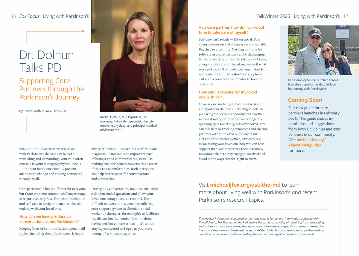 BEING A CARE PARTNER TO SOMEONE with Parkinson’ s disease can be both rewarding and demanding. Your role often extends beyond managing physical needs— it’ s about being emotionally present, adapting to change and staying connected through it all.