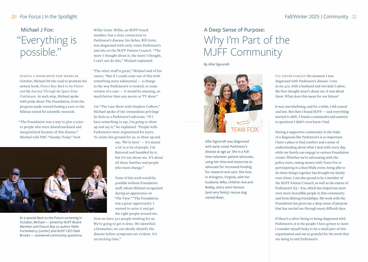 Having a supportive community in the wake of a diagnosis like Parkinson’ s is so important. I have a place to find comfort and a sense of understanding about what I deal with every day, while my family can engage in various Foundation events. Whether we’ re advocating with the policy team, raising money with Team Fox or participating in a Run / Walk event, being able to do these things together has brought my family even closer. I am also proud to be a member of the MJFF Patient Council, as well as the emcee of Parkinson’ s IQ + You, which has helped me meet even more incredible people in this community and form lifelong friendships. My work with the Foundation has given me a deep sense of purpose that has carried me through many difficult days.