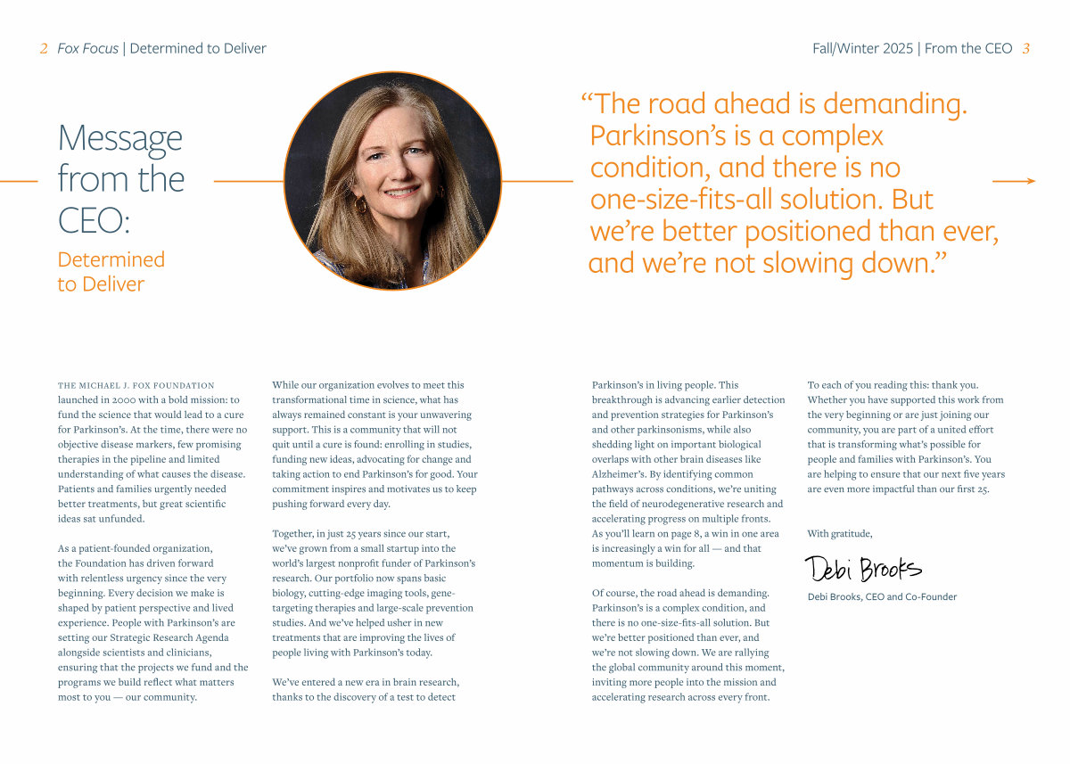 While our organization evolves to meet this transformational time in science, what has always remained constant is your unwavering support. This is a community that will not quit until a cure is found: enrolling in studies, funding new ideas, advocating for change and taking action to end Parkinson’ s for good. Your commitment inspires and motivates us to keep pushing forward every day.