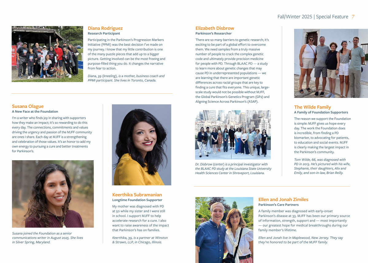 There are so many barriers to genetic research; it’ s exciting to be part of a global effort to overcome them. We need samples from a truly massive number of people to crack the complex genetic code and ultimately provide precision medicine for people with PD. Through BLAAC PD— a study to learn more about genetic changes that may cause PD in underrepresented populations— we are learning that there are important genetic differences across racial groups that are key to finding a cure that fits everyone. This unique, largescale study would not be possible without MJFF, the Global Parkinson’ s Genetics Program( GP2) and Aligning Science Across Parkinson’ s( ASAP).