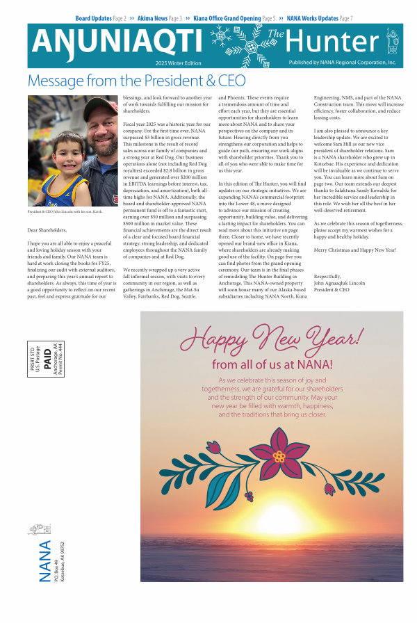 I am also pleased to announce a key leadership update. We are excited to welcome Sam Hill as our new vice president of shareholder relations. Sam is a NANA shareholder who grew up in Kotzebue. His experience and dedication will be invaluable as we continue to serve you. You can learn more about Sam on page two. Our team extends our deepest thanks to Salaktuna Sandy Kowalski for her incredible service and leadership in this role. We wish her all the best in her well-deserved retirement.