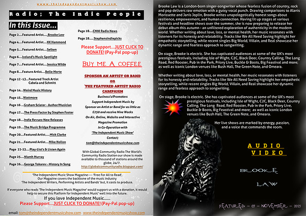 Brooke Law is a London-born singer-songwriter whose fearless fusion of country, rock and pop delivers raw emotion with a gutsy vocal punch. Drawing comparisons to Alanis Morissette and Janis Joplin, Brooke writes unapologetically honest songs about resilience, empowerment, and human connection. Having lit up stages at various festivals and headline shows over the summer, she is now preparing to release her debut album this autumn - an unfiltered exploration of authenticity in the modern world. Whether writing about love, loss, or mental health, her music resonates with listeners for its honesty and relatability. Tracks like We All Need Saving highlight her empathetic storytelling, while recent singles Big World, Villain, and Real showcase her dynamic range and fearless approach to songwriting.