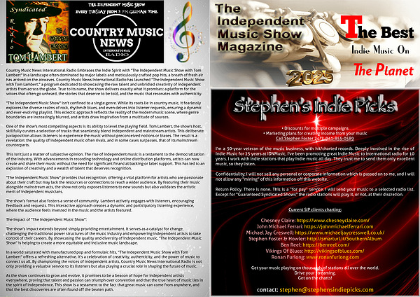 Country Music News International Radio Embraces the Indie Spirit with "The Independent Music Show with Tom Lambert" In a landscape often dominated by major labels and meticulously crafted pop hits, a breath of fresh air has arrived on the airwaves. Country Music News International Radio has launched "The Independent Music Show with Tom Lambert," a program dedicated to showcasing the raw talent and unbridled creativity of independent artists from across the globe. True to its name, the show delivers exactly what it promises: a platform for the voices that often go unheard, the stories that deserve to be told, and the music that resonates with authenticity.