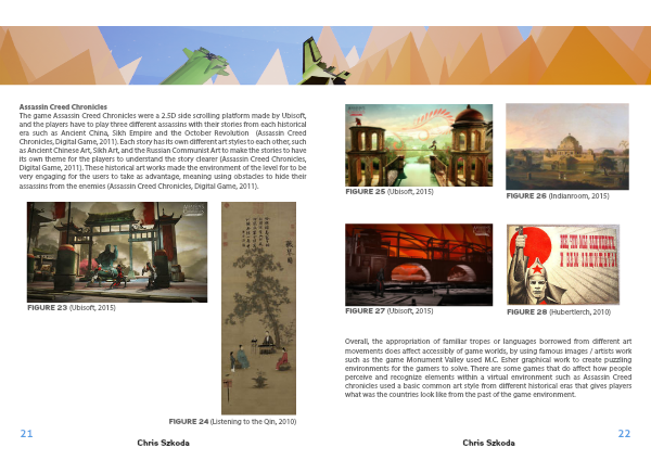 Overall, the appropriation of familiar tropes or languages borrowed from different art movements does affect accessibly of game worlds, by using famous images / artists work such as the game Monument Valley used M.C. Esher graphical work to create puzzling environments for the gamers to solve. There are some games that do affect how people perceive and recognize elements within a virtual environment such as Assassin Creed chronicles used a basic common art style from different historical eras that gives players what was the countries look like from the past of the game environment.