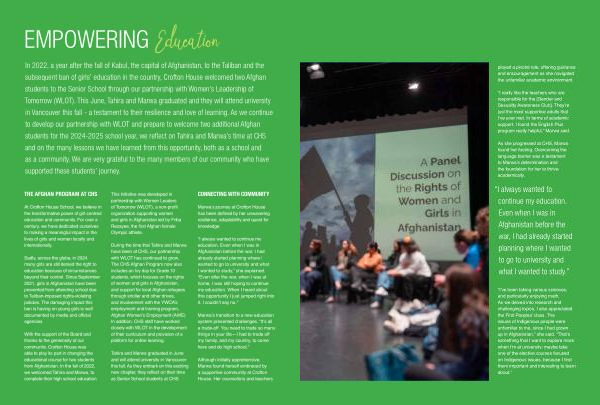 “ I ’ ve been taking various sciences , and particularly enjoying math . As we delved into research and challenging topics , I also appreciated the First Peoples ’ class . The issues of Indigenous people were unfamiliar to me , since I had grown up in Afghanistan ,” she said . “ That ’ s something that I want to explore more when I ’ m at university : maybe take one of the elective courses focused on Indigenous issues , because I find them important and interesting to learn about .”