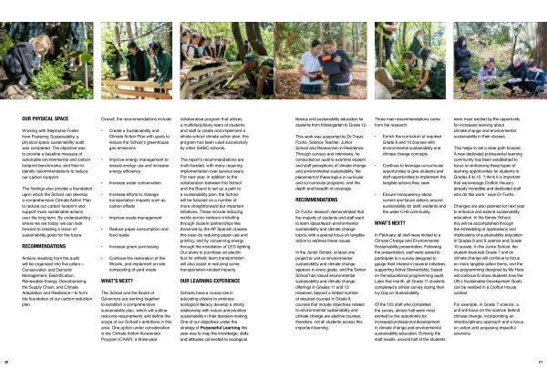 The report ’ s recommendations are multi-faceted , with many requiring implementation over several years . For next year , in addition to the collaboration between the School and the Board to set up a path to a sustainability plan , the School will be focused on a number of more straightforward but important initiatives . These include reducing waste across campus – including through student partnerships like those led by the AP Spanish classes this year – by reducing paper use and printing , and by conserving energy through the installation of LED lighting . Our plans to purchase an electric bus for athletic team transportation will also assist in reducing some transportation-related impacts .