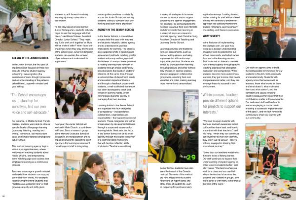In the Senior School , a consultation process held this year with teachers and students helped to define agency and to understand its practical implications for learning . The process also supported shifts in teaching and assessment methods , creating greater student autonomy and engagement . At the heart of many of these practices is making learning more relevant to students through choice and inquirybased projects that build on students ’ interests . At the same time , through a subcommittee of department heads and assistant department heads , and through a feedback process with students , a well-scaffolded framework has been developed to teach and reflect on learning habits , which will increase students ’ agency in managing their own learning ,