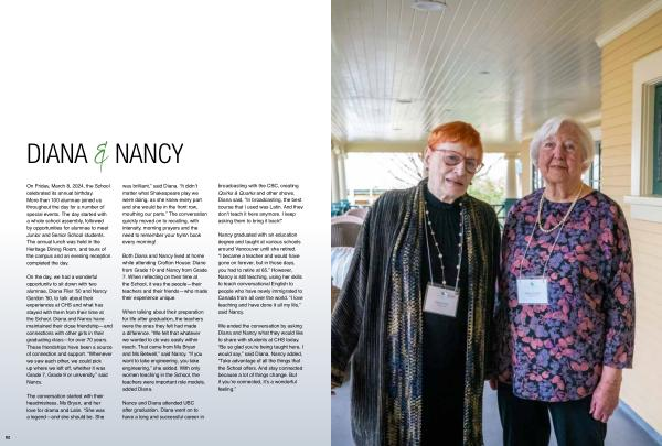 On the day , we had a wonderful opportunity to sit down with two alumnae , Diana Filer ’ 50 and Nancy Gordon ’ 50 , to talk about their experiences at CHS and what has stayed with them from their time at the School . Diana and Nancy have maintained their close friendship — and connections with other girls in their graduating class — for over 70 years . These friendships have been a source of connection and support . “ Whenever we saw each other , we could pick up where we left off , whether it was Grade 7 , Grade 9 or university ,” said Nancy .