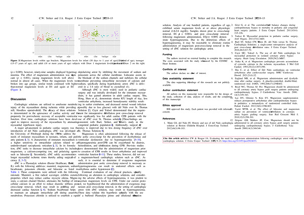 Magnesium is often administered following the release of the aortic cross-clamp for the prevention of dysrhythmias and ventricular dysfunction due to hypomagnesemia [ 8 – 10 ]. Hypomagnesemia post-CPB can be exacerbated by diuresis , hemodilution , and ultrafiltration during CPB . Previous studies have demonstrated that the administration of magnesium prior to cessation of CPB results in fewer arrhythmias and improved ventricular function [ 9 – 11 ]. These studies , however , did not use a magnesium-based cardioplegic solution such as dNC . As such , it is essential to determine if exogenous magnesium administration post aortic cross-clamp removal is necessary as hypermagnesemia can result in undesired effects such as arrhythmia and / or hypotension [ 12 ].