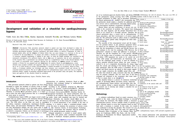 Abstract – Introduction : Risk prevention protocols related to patient care have been developed to reduce the incidence of adverse events in health care services . Cardiopulmonary bypass ( CPB ) can trigger several complications , including physiological problems , electrical , mechanical , and human failures , or defective components . In order to promote patient safety and the identification of failures before they can cause damage , it is necessary to the use of a checklist for all surgeries . Objective : To prepare and validate a checklist for cardiopulmonary bypass . Methodology : A consensus validation methodology is applied in this study , in which the Delphi technique was structured for the instrument ’ s development . Five perfusion experts , with at least five years of experience , had an active participation in this research . First , a questionnaire was structured , based on a comprehensive review of the relevant literature . Then , two rounds of assessments were conducted , allowing for the collection of experts ’ opinions . Results : In the first moment , a 42-item list was prepared and sent to the five experts for analysis . Based on participant ’ s responses , certain elements were accepted , excluded , and suggested . After that , a second 37-item list was assessed by the experts , resulting in all 37 items having an average assessment of 4 and a standard deviation 1.0 of acceptance . Based on these results , a 41-element checklist was developed , and these elements were considered crucial and relevant for the concerned analysis . Conclusion : The use of specific checklists for cardiopulmonary bypass comes into view as a highly proficient strategy , capable of promoting substantial improvements in the procedure safety and quality . The implementation and approval of this checklist should be considered .