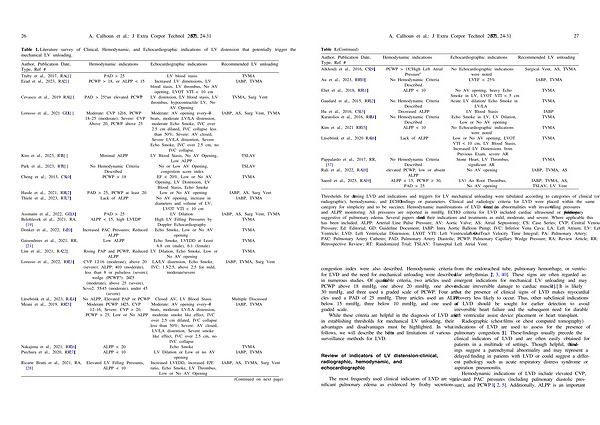 Thresholds for defining LVD and indications and triggers for LV mechanical unloading were tabulated according to categories of clinical ( or radiographic ), hemodynamic , and ECHO findings or parameters . Clinical and radiologic criteria for LVD were placed within the same category for simplicity and to be succinct . Hemodynamic manifestations of LVD were defined as abnormalities with invasive filling pressures and ALPP monitoring . All pressures are reported in mmHg . ECHO criteria for LVD included cardiac ultrasound or pulmonary findings suggestive of pulmonary edema . Several papers stratified their indications and treatments as mild , moderate , and severe . Where applicable this has been included . ALPP : Arterial Line Pulse Pressure ; AV : Aortic Valve ; AS : Atrial Septostomy ; CS : Case Series ; CVP : Central Venous Pressure ; Ed : Editorial ; GD : Guideline Document ; IABP : Intra Aortic Balloon Pump ; IVC : Inferior Vena Cava ; LA : Left Atrium ; LV : Left Ventricle ; LVD : Left Ventricular Distension ; LVOT VTI : Left Ventricular Outflow Tract Velocity Time Integral ; PA : Pulmonary Artery ; PAC : Pulmonary Artery Catheter ; PAD : Pulmonary Artery Diastolic ; PCWP : Pulmonary Capillary Wedge Pressure ; RA : Review Article ; RR : Retrospective Review ; RT : Randomized Trial ; TSLAV : Transeptal Left Atrial Vent .