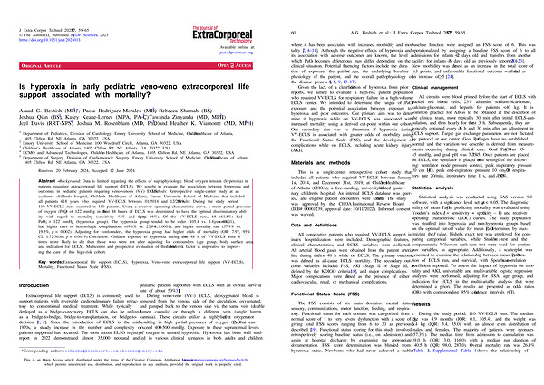 Abstract – Background: Data is limited regarding the effects of supraphysiologic blood oxygen tension( hyperoxia) in patients requiring extracorporeal life support( ECLS). We sought to evaluate the association between hyperoxia and outcomes in pediatric patients requiring veno-venous( VV) ECLS. Methods: Retrospective single-center study at an academic children’ s hospital, Children’ s Healthcare of Atlanta, Emory University School of Medicine that included all patients 0 – 18 years who required VV-ECLS between 01 / 2014 and 12 / 2019. Results: During the study period 110 VV-ECLS runs occurred in 110 patients. Using a receiver operating characteristic curve, a mean partial pressures of oxygen( PaO 2) of 122 mmHg in the first 48 hours of ECLS was determined to have the optimal discriminatory ability with regard to mortality( sensitivity 41 % and specificity 86 %). Of the VV-ECLS runs, 68( 61.8 %) had PaO 2 > 122 mmHg( hyperoxia group). The hyperoxia group tended to be older( 105.4 vs. 1.6 months, p = 0.001), had higher rates of hemorrhagic complications( 69.6 % vs. 25.3 %, p = 0.0001), and higher mortality rate( 57.9 % vs. 19.5 %, p = 0.002). Adjusting for confounders, the hyperoxia group had higher odds of mortality( OR: 7.97, 95 % CI: 1.72 – 36.86, p = 0.0079). Conclusion: Children exposed to hyperoxia during the first 48 h of VV-ECLS were 8 times more likely to die than those who were not after adjusting for confounders( age group, body surface area, and indication for ECLS). Multicenter and prospective evaluation of this modifiable risk factor is imperative to improving the care of this high-risk cohort.