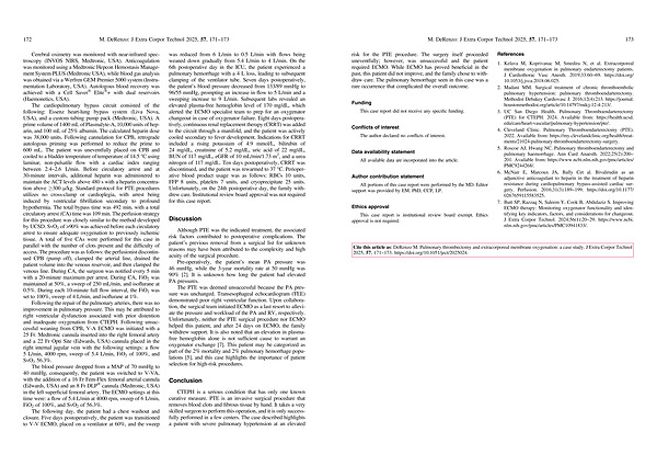 The PTE was deemed unsuccessful because the PA pressure was unchanged. Transesophageal echocardiogram( TEE) demonstrated poor right ventricular function. Upon collaboration, the surgical team initiated ECMO as a last resort to alleviate the pressure and workload of the PA and RV, respectively. Unfortunately, neither the PTE surgical procedure nor ECMO helped this patient, and after 24 days on ECMO, the family withdrew support. It is also noted that an elevation in plasmafree hemoglobin alone is not sufficient cause to warrant an oxygenator exchange [ 7 ]. This patient may be categorized as part of the 2 % mortality and 2 % pulmonary hemorrhage populations [ 5 ], and this case highlights the importance of patient selection for high-risk procedures.