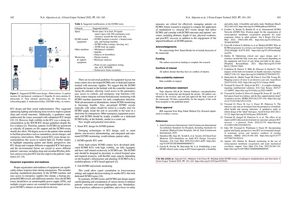 14. Aguirre AD, Shelton K. Remote monitoring in the use of extracorporeal membrane oxygenation and acute mechanical circulatory support. Curr Opin Crit Care 2022; 28:308--314. https:// doi. org / 10.1097 / MCC. 0000000000000949. Cite this article as: Aljassim NA, Abdulaziz S & Fraser JF. Building better ECMO rooms: a roadmap to standardization and innovation. J Extra Corpor Technol 2025, 57, 181--183. https:// doi. org / 10.1051 / ject / 2025032.