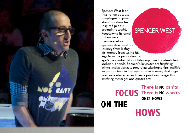 Spencer West is an inspiration because people got inspired about his story, he inspired people around the world. People who listened to him were mesmerized as Spencer described his journey from losing