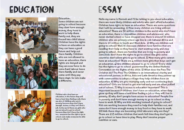 Hello my name is Hannah and i'll be talking to you about education, there are more likely children and adults who can't afford education. Children have rights to have an education. These are some questions that I will be answering. 1) How many children are living without education? There are 58 million children in the world who don't have an education, there is 124 million children and adolescent who never started school or have dropped out, there is around 30 million children who are primary school age live in sub-Saharan Africa and there is 10 million in South and West Asia. 2) Why are children not going to school? Well it’s because children have families that are needing their help so they have to start working early and stop going to school , there are families that are living in poverty and some kids don’t have the rights to go to school like girls some countries don't allow girls to go to school. 3) How many girls cannot have an education? There are 4 million more girls than boys can’t get an education. 4) Are children allowed to go to school? Every child has the rights to go to school guaranteed by the United Nations Convention on the Rights of the child. 5) What does the Free The Children do? The Free The Children is an international charity and educational partner, in Africa, Asia and Latin America they partner up with communities to adopt a village they help children have an education. 6) Why are girls marrying early and not continuing their education? Girls are forced to get married early and are often pulled out of school. 7) Why is access to education important? This is important because if children don't have an education, when they grow up they will have a hard time finding a job or they will live in poverty. 8) why don't people have access to education? People live in poverty and don't have enough money to go to school so they have to work. 9) Why are kids working instead of going to school? Kids are working because they need to help their families out, and some don't have enough money to buy food so they have to work. 10) kids these days are becoming child labourers why are they? There are 215 million children that work full time they don't get to go to school or have time to play. Many don't receive proper nutrition or care.