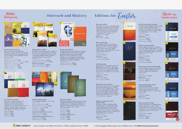 NLT Outreach Bible This edition of the easy-to-understand New Living Translation Bible is perfect for bulk distribution. Features: book introductions, section headings, index of key passages, 365-day reading plan, plan of salvation, 7.5-point type. 22 x 13.5cm. NLT OM 457440 Hardback $ 7.99 Not pictured: 431410 Paperback $ 4.99