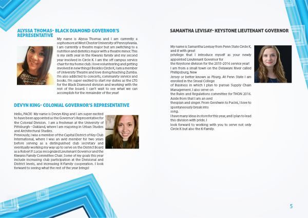 My name is Alyssa Thomas and I am currently a sophomore at West Chester University of Pennsylvania. I am currently a theatre major but am switching to a nutrition and dietetics major with a theatre minor. This is my sixth year in the Kiwanis family and my second year involved in Circle K. I am the off campus service chair for my home club. I love volunteering and getting involved in new things! Besides Circle K, I am a member of University Theatre and love doing/teaching Zumba. I'm also addicted to concerts, community service and books. I'm super excited to start my duties as the LTG for the Black Diamond division and working with the rest of the board. I can't wait to see what we can accomplish for the remainder of the year!