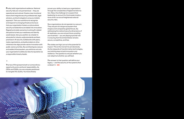Finally, build organizational resilience. National security risks are not just technical— they are operational and cultural. Create cross-functional teams that integrate security professionals, legal advisors, and technologists to ensure a holistic approach. Train your workforce to recognize and respond to emerging threats and ensure that your organization fosters a culture where security considerations are baked into innovation. Regularly simulate scenarios involving AI-related disruptions to test your readiness and identify weaknesses. Use your position as a leader to advocate for industry-wide standards and best practices in AI security. Collaborate with peers, trade organizations, and policymakers to drive initiatives that align private-sector innovation with public-sector priorities. By contributing to a secure and resilient AI ecosystem, you reinforce not only your organization’ s safety but also its reputation as a responsible industry leader.